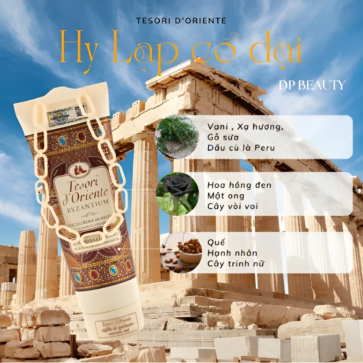 - Sữa Tắm Nước Hoa Tesori D'oriente Hy Lạp Cổ Đại lấy cảm hứng từ nghi thức của vàng và đá quý từ thành phố Byzantium huyền thoại, chiết xuất từ tinh chất Hoa hồng đen và nhựa thơm quý hiếm với khả năng dưỡng ẩm, làm dịu, kháng viêm, giảm thâm, làm mềm để mang lại làn da mềm mại, căng tràn sức sống.
