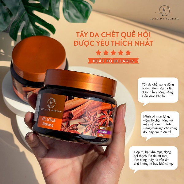Tẩy Da Chết Toàn Thân Quế Hồi Và Café 380g Gel Scrub Coffee & Cinnamon Cloves là tẩy tế bào chết toàn thân đến từ thương hiệu mỹ phẩm Eksklyziv Kosmetik của Cộng hoà Belarus với chiết xuất từ các thành phần thiên nhiên như cam, chanh, bưởi, trà xanh, quế hồi và cà phê loại bỏ nhẹ nhàng các tế bào chết, lớp sừng bong tróc trên da, đem lại làn da ẩm mịn, thúc đẩy quá trình tái tạo da.
