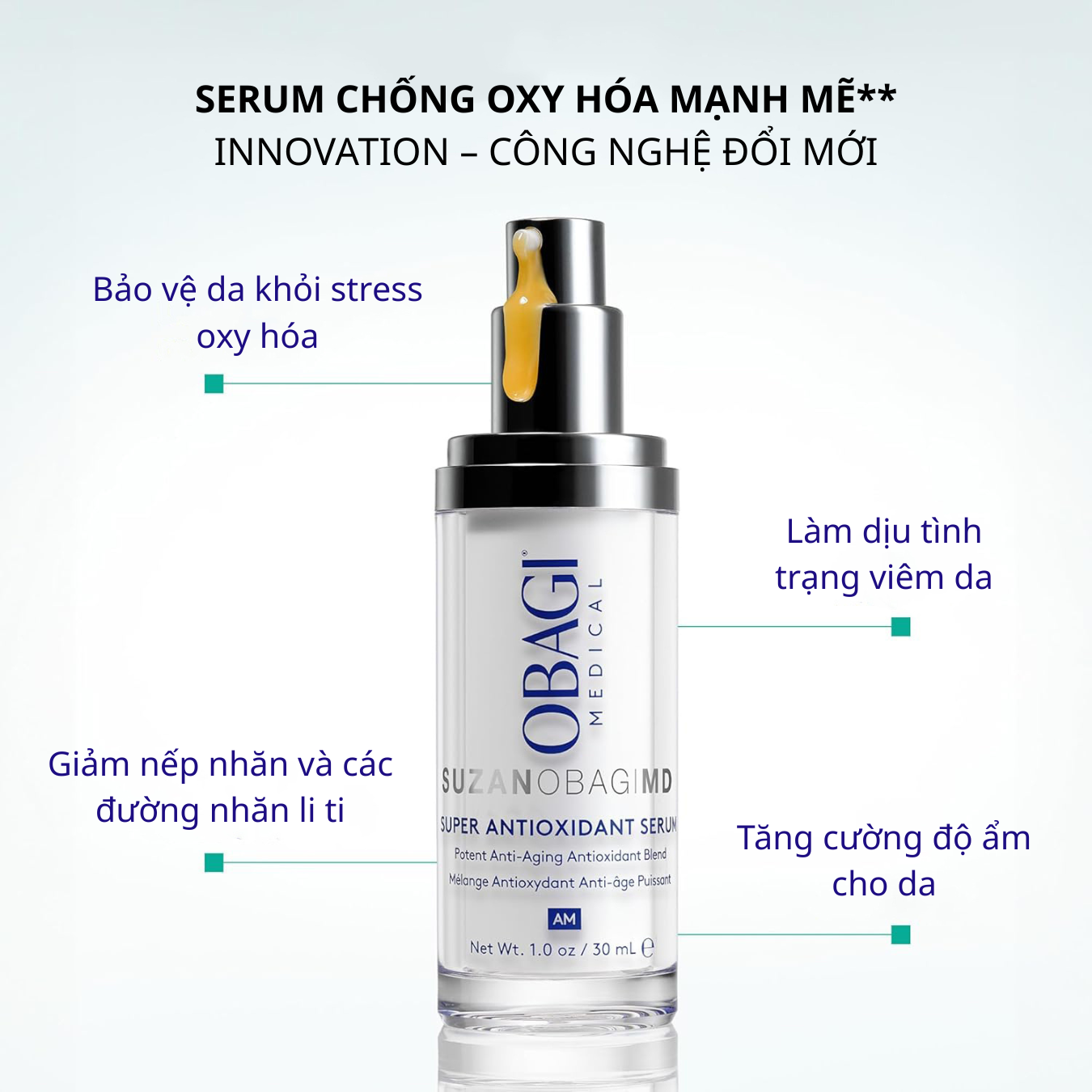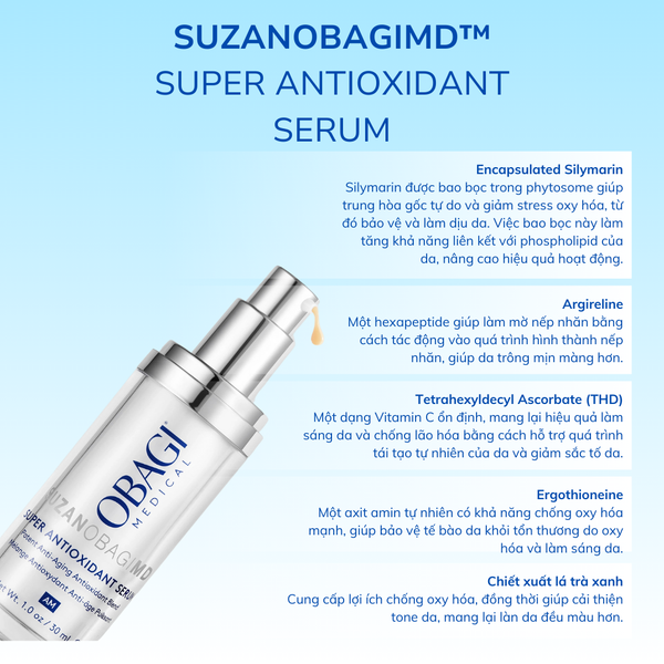 SUZANOBAGIMD® Super Antioxidant được nghiên cứu và phát triển bởi chuyên gia Suzan Obagi, mang đến giải pháp toàn diện cho nhiều tình trạng da, đặc biệt lý tưởng cho da nhạy cảm. Công thức hiệp đồng giữa các thành phần có tác dụng chống oxy hóa mạnh mẽ cùng các thành phần có tác dụng làm dịu da, giúp bảo vệ da trước các tác nhân từ môi trường. Sản phẩm hỗ trợ làm giảm dấu hiệu lão hóa trên da, làm mờ nếp nhăn, cải thiện đốm nâu, làm sáng và làm đều màu da, đồng thời làm dịu cảm giác kích ứng da với khả năng cấp ẩm để duy trì làn da khỏe mạnh và rạng rỡ.