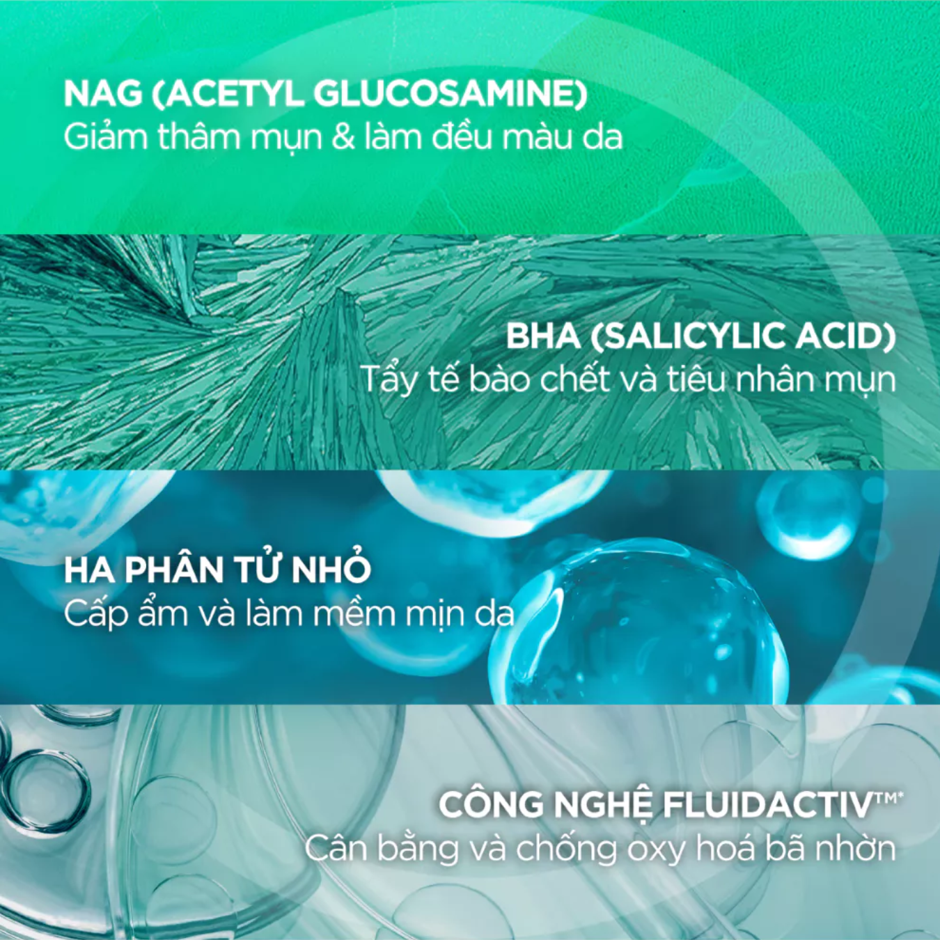 Giảm mụn hiệu quả từ gốc: Điều tiết bã nhờn và hạn chế vi khuẩn P. acnes với công nghệ độc quyền Fluidactiv™, ngăn ngừa hình thành mụn mới.