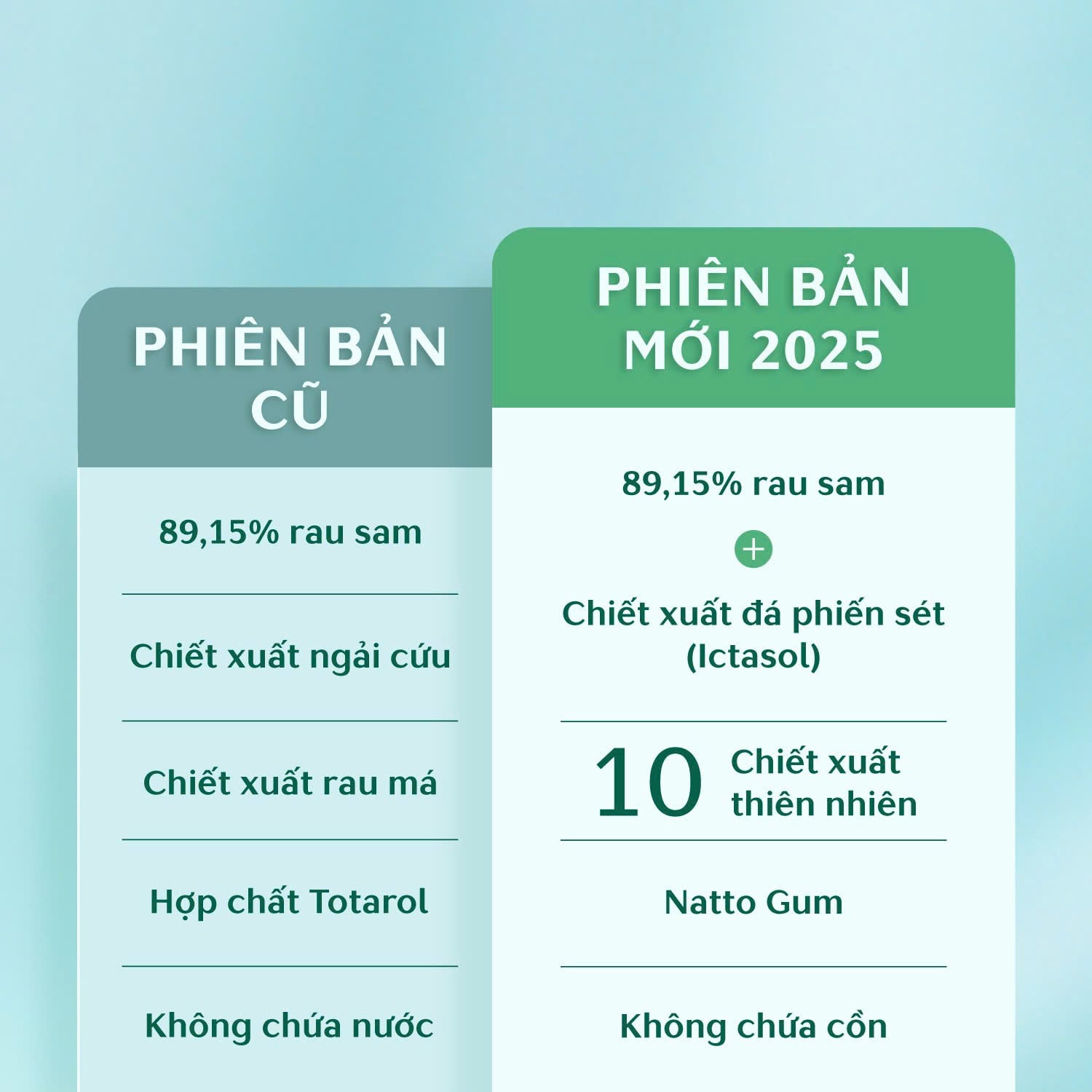 10 chiết xuất thực vật (rau má, quả nho, đậu bắp, rễ sen, khoai lang núi, lô hội, nấm mỡ, nấm Grifola Frondosa, nấm hương, ngải cứu) – Hỗ trợ giảm mụn, chống oxy hóa, phục hồi da chuyên sâu.